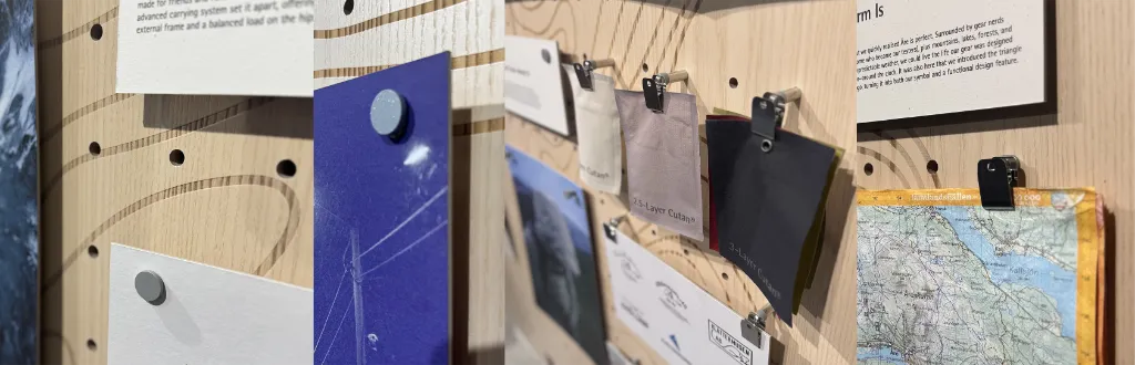 We designed the Klättermusen story in a way that felt tactile and close-up, not just a printed campaign. We wanted customers to be able to stand in front of it, read field notes, see early product shots, spot details, and feel that the brand has really been out there, in bad weather, for a long time. The proof of the craft. The board needed to handle new product chapters and limited editions, archive spotlights and design details, local events – run clubs, film nights, talks, everyday community news that matters to outdoor people.