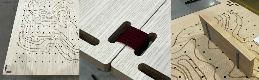 The hardware is kept deliberately quiet: small, unobtrusive clips and hooks that hold paper, card or objects without competing with what’s on display. Larger holes at the top and bottom allow the boards to be suspended or tied together using Klättermusen’s iconic red rope, a small detail that hints at connection between boards, stores, brand and community. On the face, a laser-etched contour pattern taken from Klättermusen’s world offers a subtle nod to the outdoors. The boards are finished in ash veneer to sit naturally with the rest of the store fixtures and supported by two slim metal brackets on the back. Nothing is over-designed, it feels like something you might find in a well-kept gear garage.